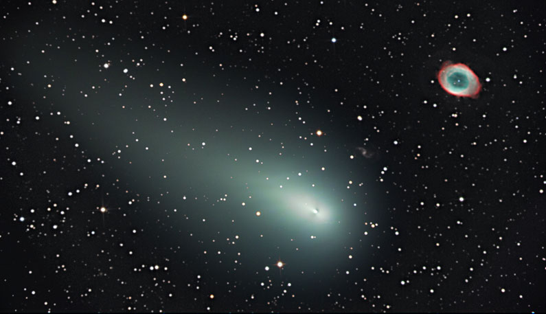 Der Komet Schwassmann-Wachmann 3 wandert am Ringnebel (M 57) im Sternbild der Leier vorbei.