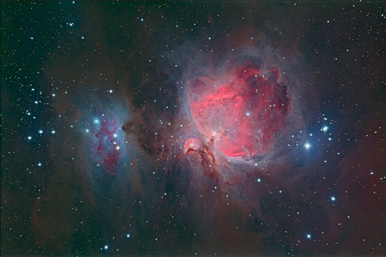 Der große Orion-Nebel (M 42) ist ein Sternentstehungsnest in etwa 1.500 Lichtjahren Distanz. Junge, heiße, bläulich leuchtende Sterne regen durch ihre intensive Ultraviolett-Strahlung die interstellaren Gaswolken zum rötlichem Leuchten an. Das blaue Licht stammt von dem am interstellaren Staub reflektierten Sternenlicht.