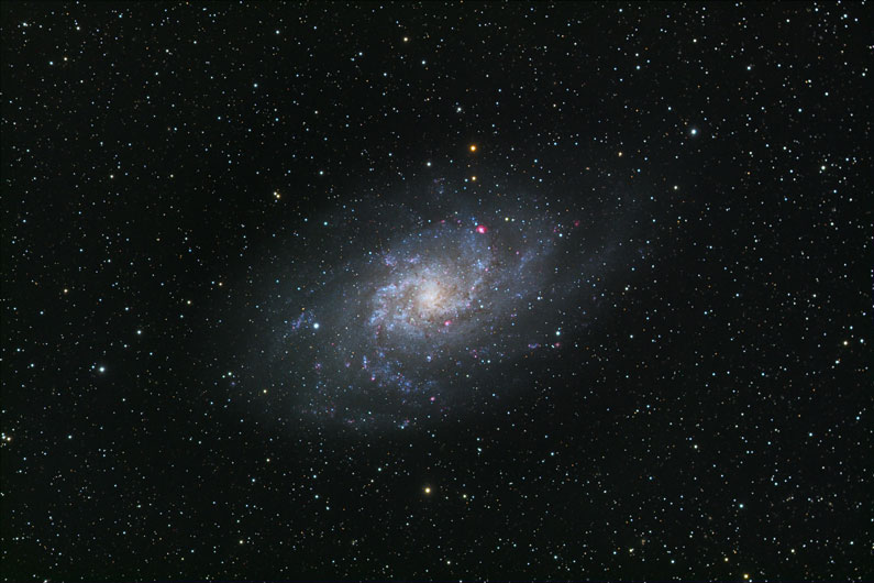 Die Triangulum-Galaxie (M 33) im Sternbild Dreieck. Mit rund drei Millionen Lichtjahren Entfernung zählt sie noch zu unseren Nachbarmilchstraßen. Man blickt fast senkrecht auf diese schöne Spiralgalaxie.