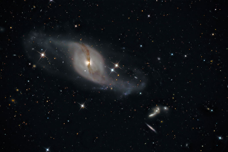 Die Galaxie NGC 3718 im Sternbild Großer Bär. Die Spiralarme wurden durch die Begegnung mit einer Nachbargalaxie auseinander gezogen.