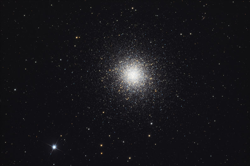 Der Kugelsternhaufen M 13 im Sternbild Herkules - der schönste seiner Art am nördlichen Sternenhimmel. Rund eine Million Sterne drängen sich hier auf einem Raum von knapp 100 Lichtjahren Durchmesser, Entfernung 25.000 Lichtjahre trennen uns von dieser Sternengesellschaft.