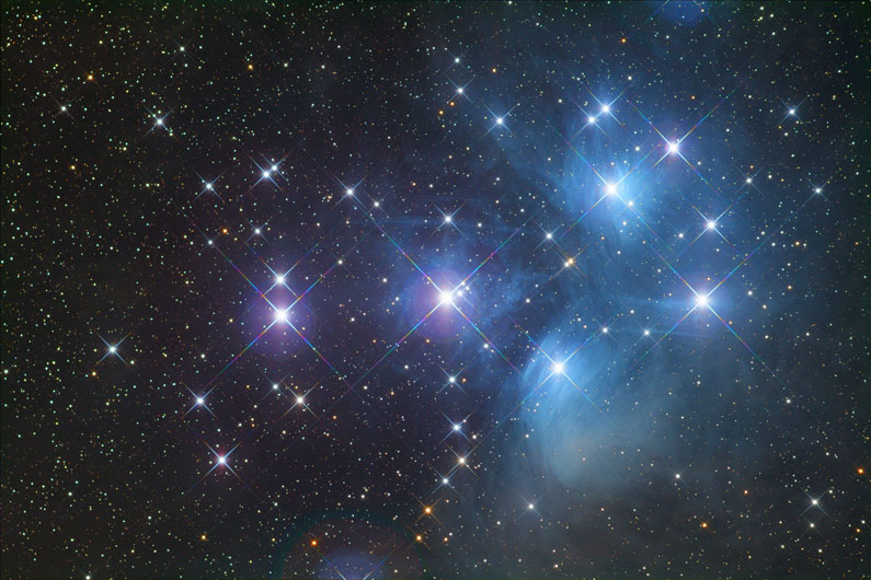 Der offene Sternhaufen der Plejaden (M 45), auch als Siebengestirn bekannt, im Sternbild Stier. Mit bloßen Augen sind sechs bis neun Sterne zu erkennen. Rund 120 Sonnen enthält dieser Haufen, der knapp 400 Lichtjahre von uns entfernt ist.